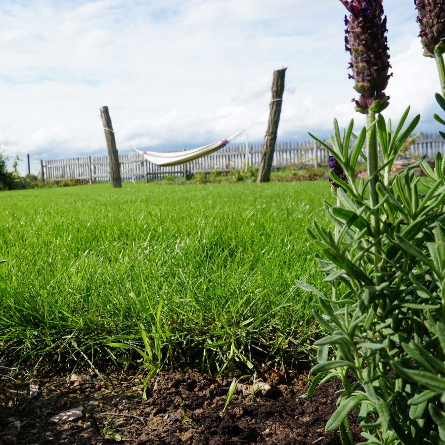 Ursprünglich wünschte sich der Kunde Rasen zum aussähen. Allerdings konnten wir ihn aufgrund der Feldnähe und dem zu erwartenden Wildkrautwuchs von Rollrasen überzeugen.