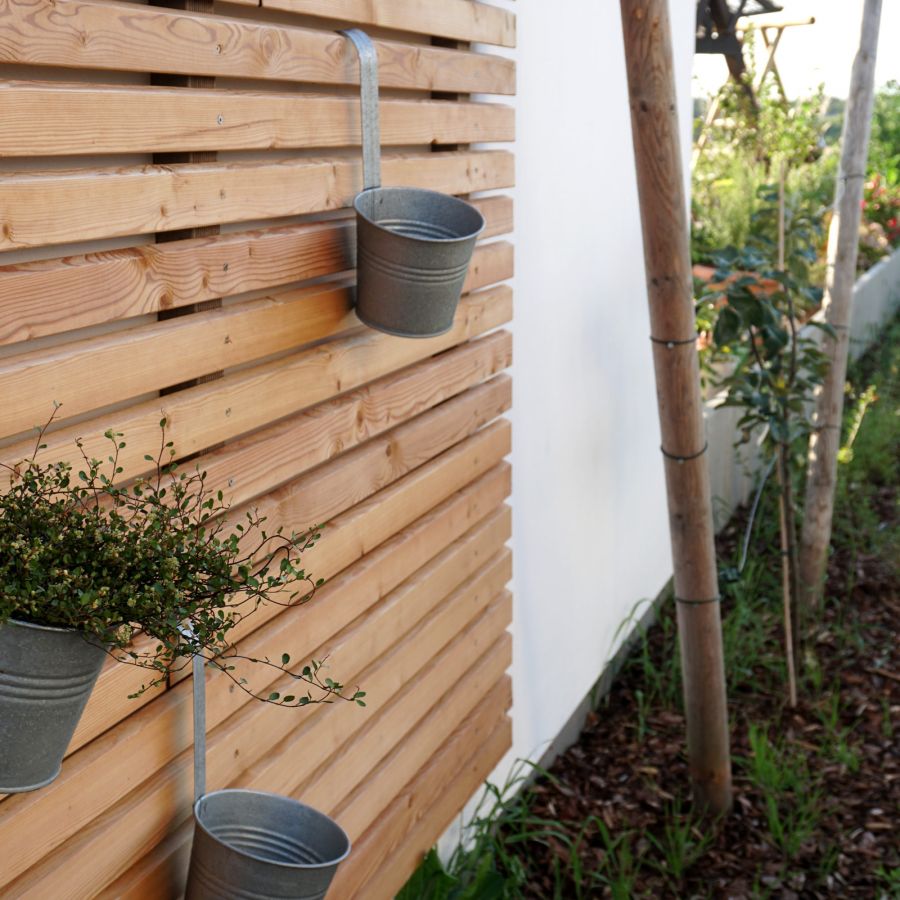 Darüber hinaus wurde die Garagenwand des Nachbargrundstückes mit Holzelementen und Spalierobstbäumen verziert.
